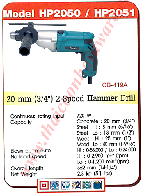 | สว่านกระแทรก makita hp2050 / hp2051, สว่านกระแทรก makita hp2050/hp2051, speed hammer drill hp2050, speed hammer drill hp2051, 20 mm (3/4") 2-speed hammer drill, 750w, 750w moter |