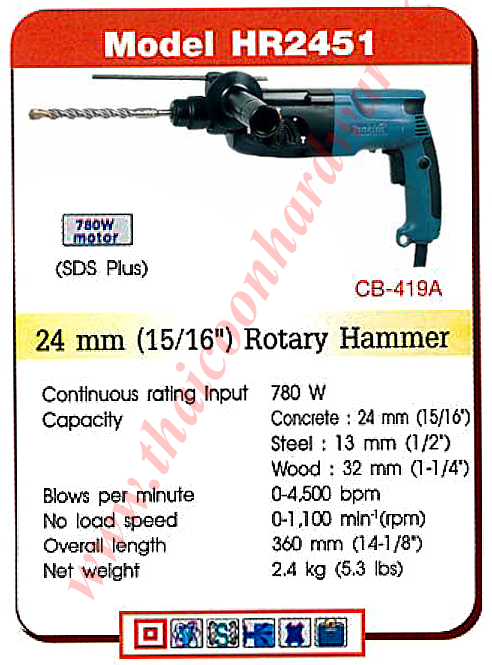 | สว่านกระแทกโรตารี่ makita hr2451, 24 mm (15/16") rotary hammer, rotary hammer makita hr2451, 780w, 780w motor, hammer hr2451, สว่านโรตารี makita hr2451, สว่านโรตารี่ 2 ระบบ makita hr2451 |