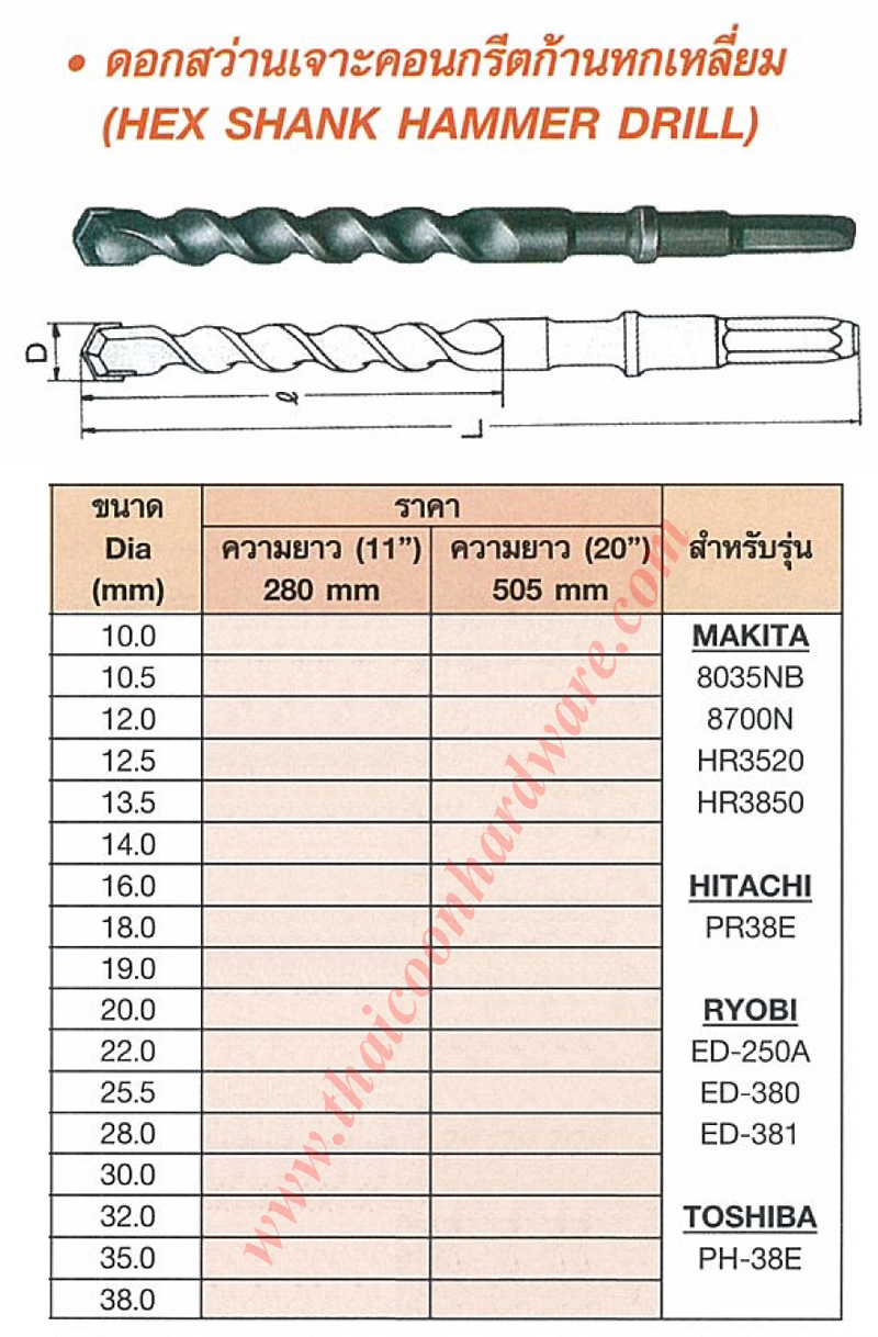 | ดอกสว่านเจาะคอนกรีตก้านหกเหลี่ยม (hex shank hammer rdill) |