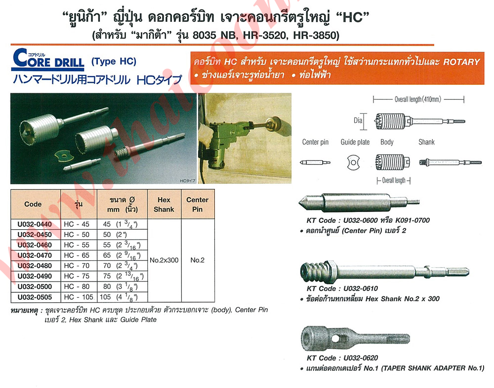 | ดอกคอร์บิท เจาะคอนกรีตรูใหญ่ HC, 8035nb, hr3520, hr3850, 8035 n, hr-3520, hr-3850, เจาะคอนกรีตรูใหญ่, เจาะรูแอร์, ดอกนำศูนย์ (Center Pin), ข้อต่อการหกเหลี่ยม, แกนต่อดอกเตเปอร์ |