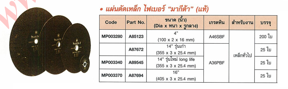 สนใจ แผ่นตัดเหล็ก ไฟเบอร์ makita ติดต่อได้ที่เบอร์ Tel: 02-3935898, 091-7899265, Fax:02-3935894 Email: joypst@hotmail.com, ID Line : 789batteryplus