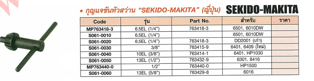 | สนใจ กุญแจหัวสว่าน sekido-makita ติดต่อได้ที่เบอร์ Tel: 02-3935898, 091-7899265, Fax:02-3935894 Email: joypst@hotmail.com, ID Line : 789batteryplus |