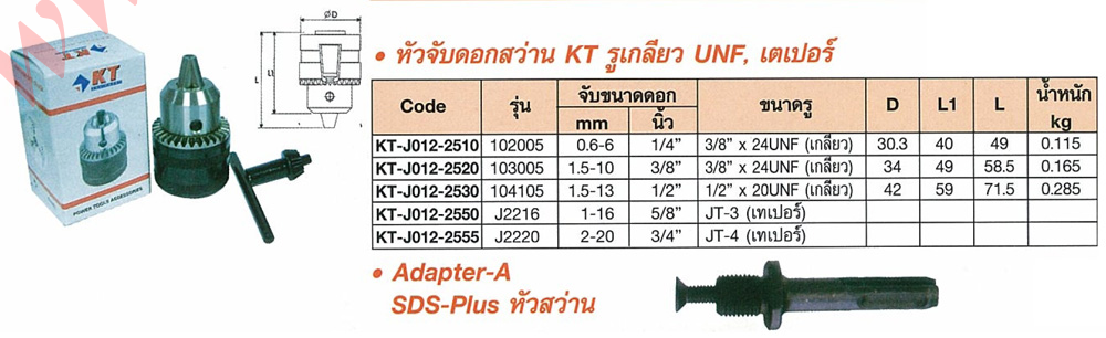 | สนใจ หัวจับดอกสว่าน KT รูเกลียว ติดต่อได้ที่เบอร์ Tel: 02-3935898, 091-7899265, Fax:02-3935894 Email: joypst@hotmail.com, ID Line : 789batteryplus |