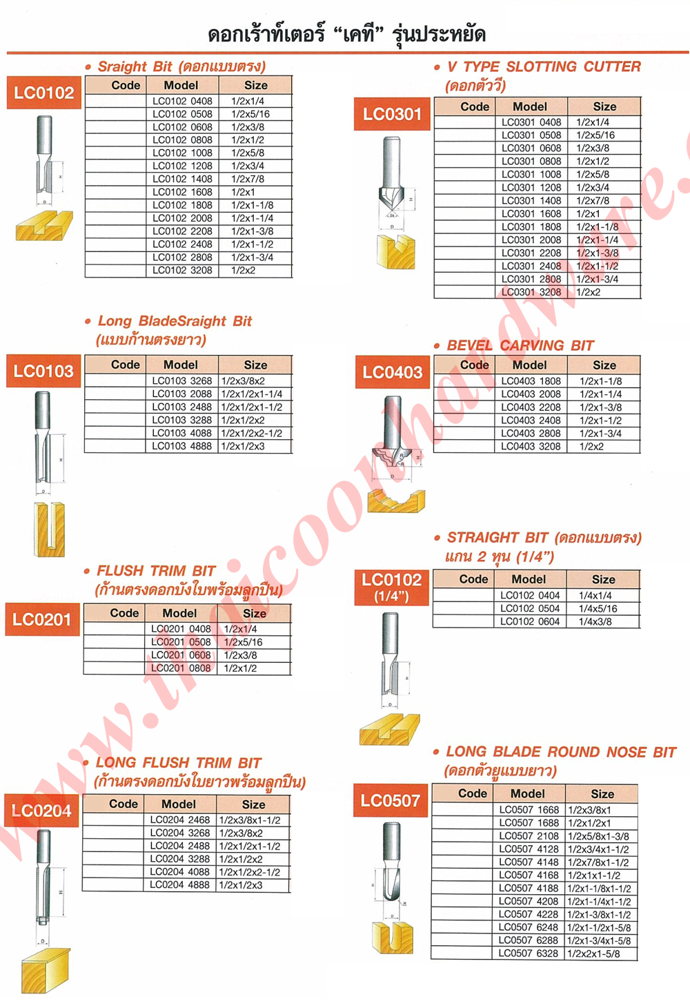 ดอกเร้าท์เตอร์, sraight bit (ดอกแบบตรง), v type slotting cutter (ดอกตัววี), long bladesraight bit (แบบก้านตรงยาว), bevel carving bit, flush trim bit (ก้านตรงดอกบังใบพร้อมลูกปืน), straight bit (ดอกแบบตรง) แกน2 หุน (1/4"), long flush trim bit (ก้านตรงดอกบังใบยาวพร้อมลูกปืน), long blade round nose bit (ดอกตัวยูแบบาว)