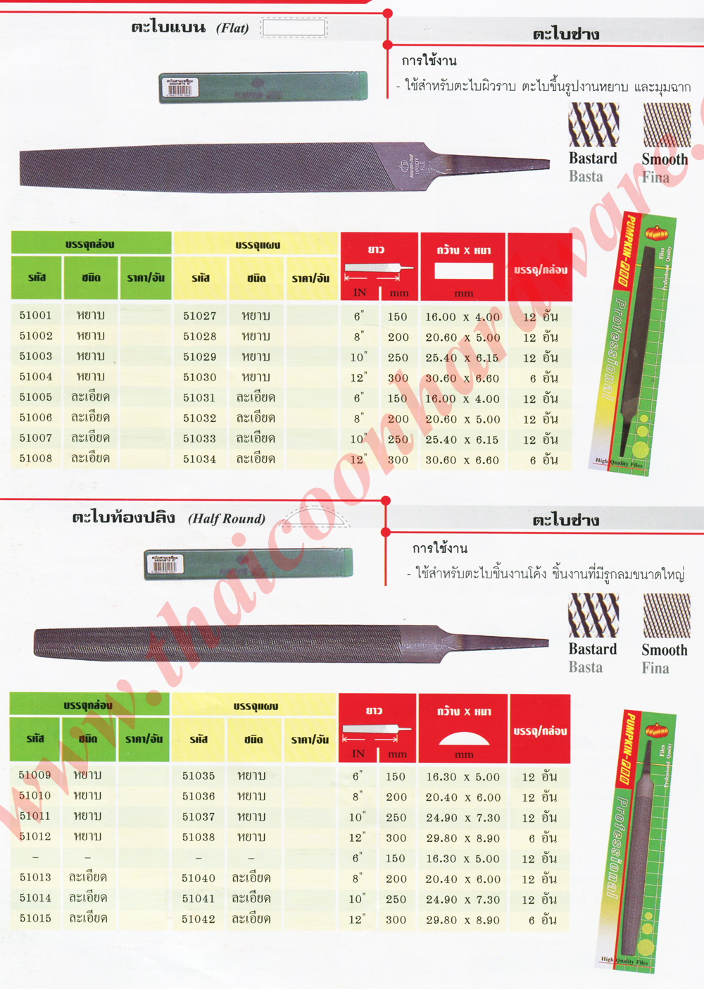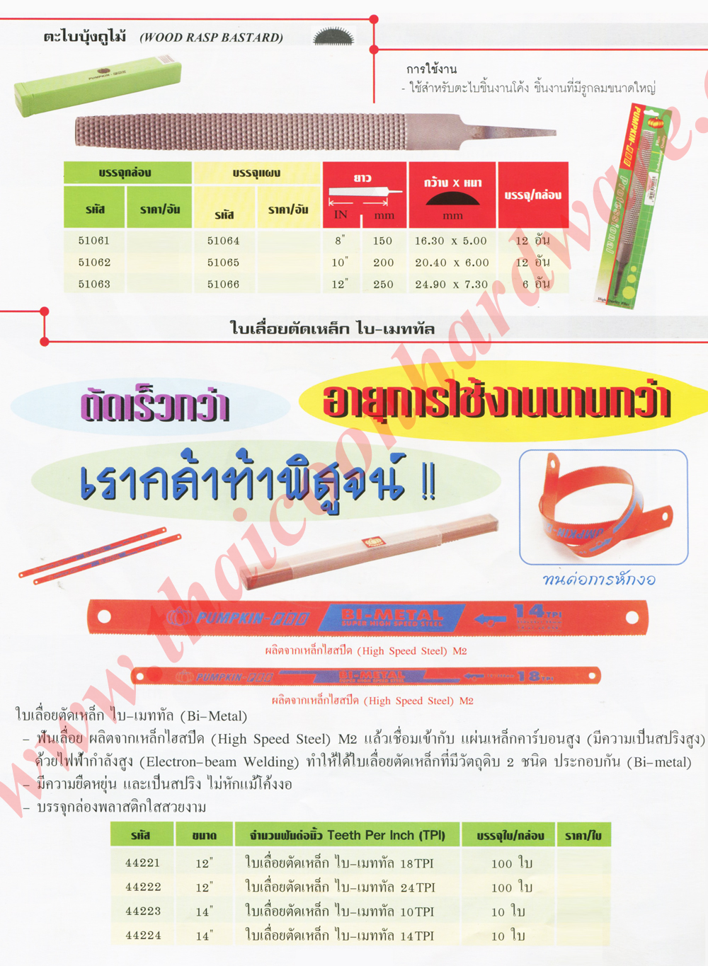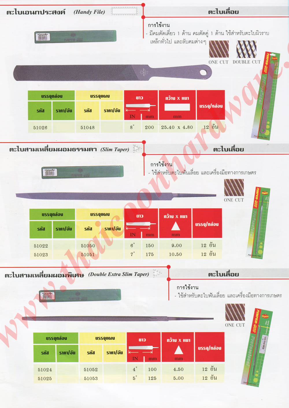 | ตะไบแบน, flat, ตะไบช่าง, ตะไบผิวราบ, ตะไบขึ้นรูปงานหยาบ, bastard basta, smooth fina, machinist files, pumpkin-pro, ตะไบท้องปลิง (half round), ตะไบชิ้นงานโค้ง, ตะไบช่าง, ตะไบกลม, ตะไบ, ตะไบกลม(round), ตะไบรูทรงกลม, ตะไบเหลี่ยม (square), ตะไบร่องลิ่ม, ตะไบสามเหลี่ยมอ้วน, ตะไบสามเหลี่ยมอ้วน(heavy taper), ตะไบฟันเลื่อย, ตะไบสามเหลี่ยมผอมพิเศษ, double extra slim taper, ตะไบบุ้งถูไม้, wood rasp bastard, professional hand tools, ใบเลื่อยตัดเหล็ก, ใบเลื่อย, ไบ-เมททัล (bi-metal), high speed steel, |