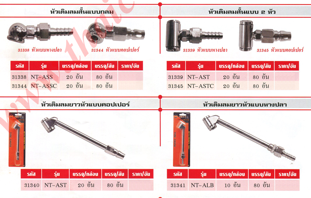 | หัวเติมลมสั้นแบบกลม, หัวเติมลมสั้นแบบ 2หัว, หัวเติมลมยาวหัวแบบคอปเปอร์, หัวเติมลมยาวแบบหางปลา, ปืนฉีดลม ด้ามพลาสติก, ปืนฉีดลม 5ตัว/ชุด |