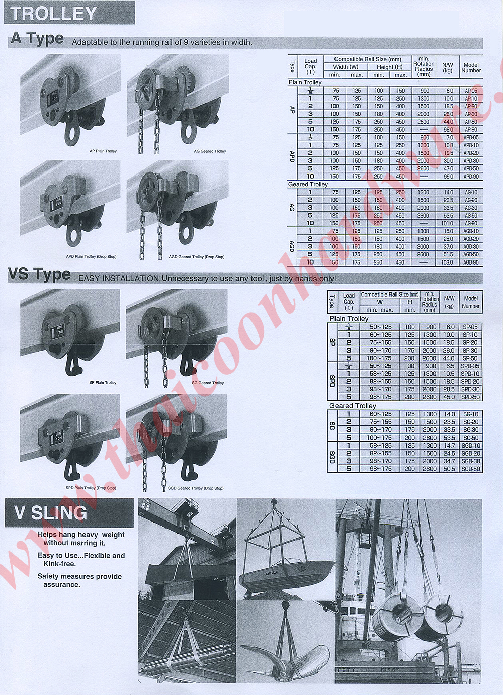 | Trolley A Type, trolley VS Type, V SLING, AP, APD, AG, AGD, SP, SPD, SG, SGD |