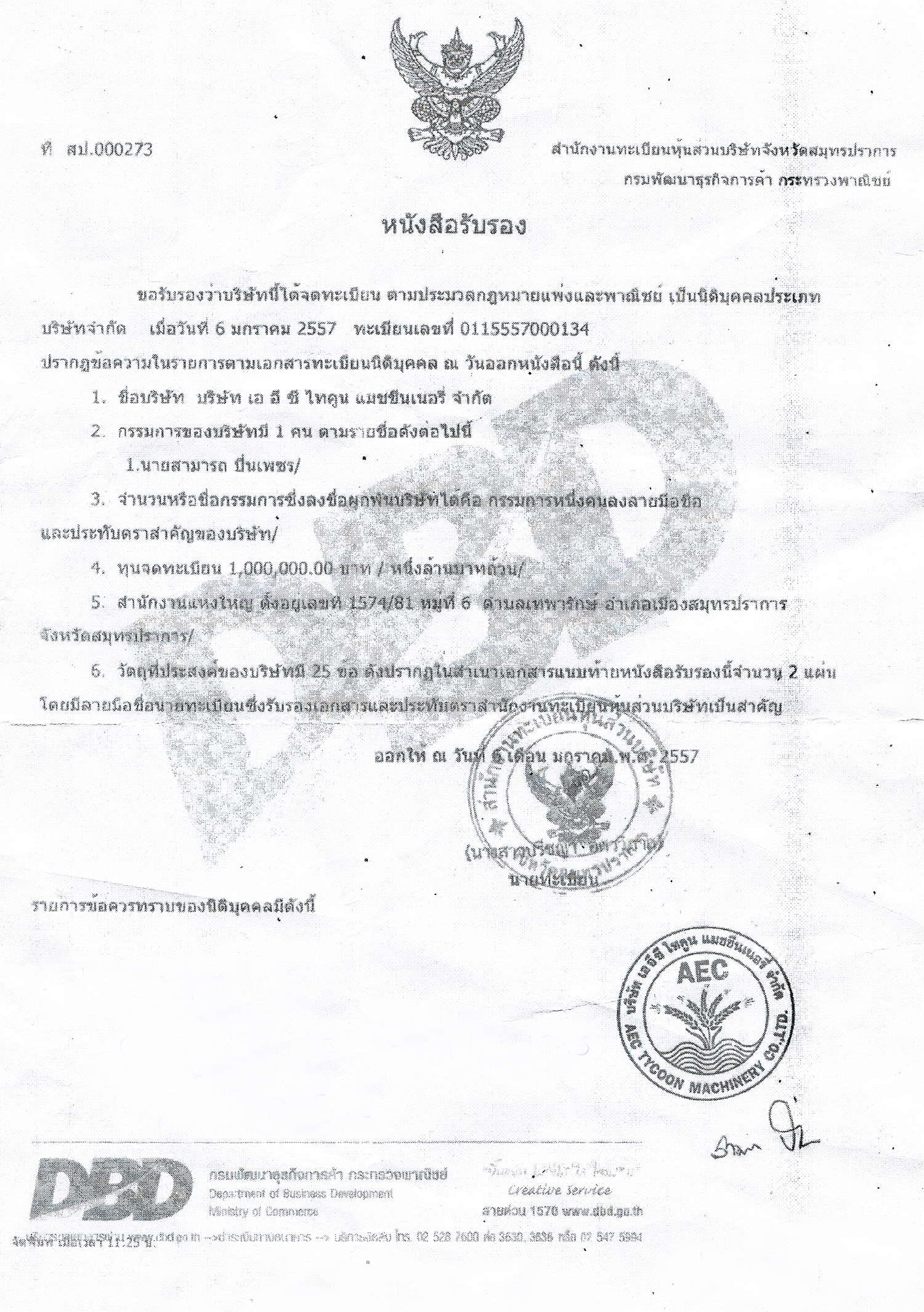 ทะเบียนนิติบุคคลเลขที่ 0115557000134