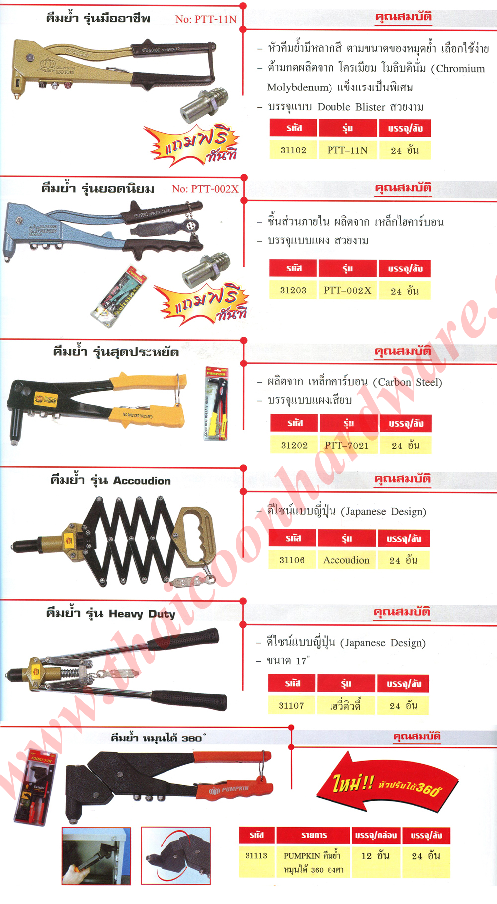 | 31102, 31203, 31202, 31106, 31107, 31113, ptt-11n, ptt-002x, ptt-7021, accoudion, heavy duty, เฮวี่ดิวตี้, pumpkin คีมย้ำ หมุนได้ 360 องศา |